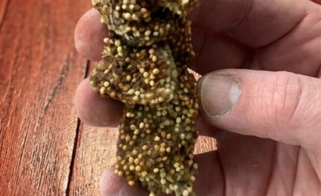 I was just walking along the shoreline, not really looking for anything special… when I suddenly spotted this strange orange blob lying in the sand.