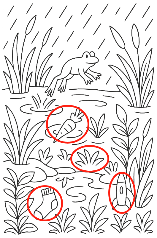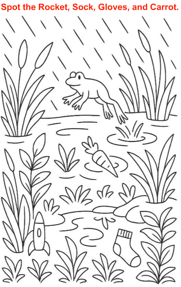 Our rainy frog pond scene isn’t just a simple drawing—it’s an invitation to explore, imagine, and celebrate the thrill of discovery. As you hunt for that carrot, sock, and rocket among raindrops and cattails, you sharpen your mind, relieve stress, and unlock your inner storyteller. Whether you’re sharing the fun with friends, challenging younger minds, or sneaking in a quick brain boost, this hidden object puzzle offers endless delight. So grab a printed copy (or sketch one of your own), settle in by a cozy window, and let the hunt begin—happy sleuthing! ➕
