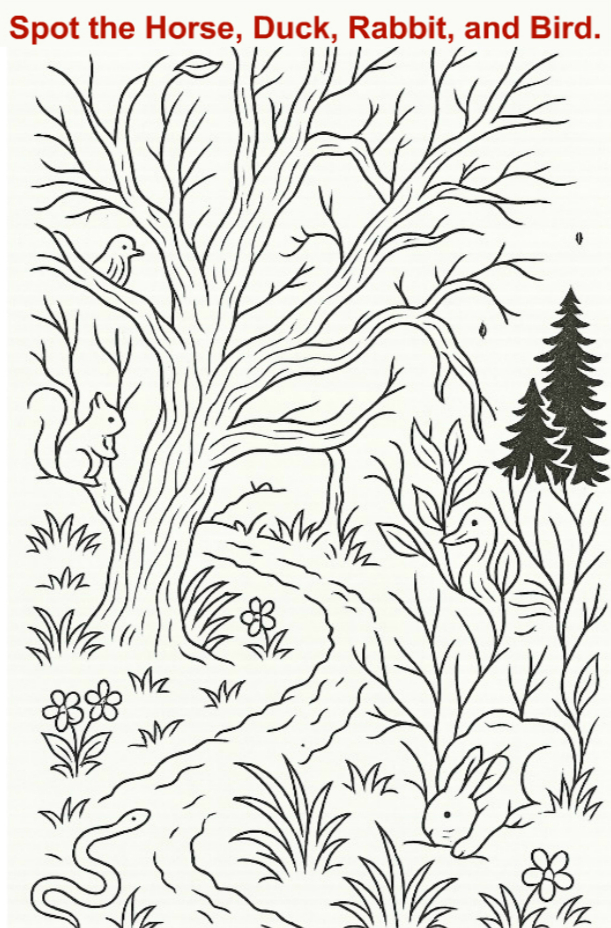 Then there’s the graceful duck, half-concealed among leafy ferns, perhaps searching for a cozy pond just beyond view. Up in the branches, a confident songbird has found its perfect perch—a spot where it can serenade the whole woodland with cheerful melodies. Each creature adds its own flavor to this idyllic scene: the squirrel’s playful energy, the bunny’s gentle inquisitiveness, the snake’s silent elegance, and the duck’s serene wisdom. When you color these animals, you’re not just filling in lines—you’re honoring the intricate ecosystem they represent.