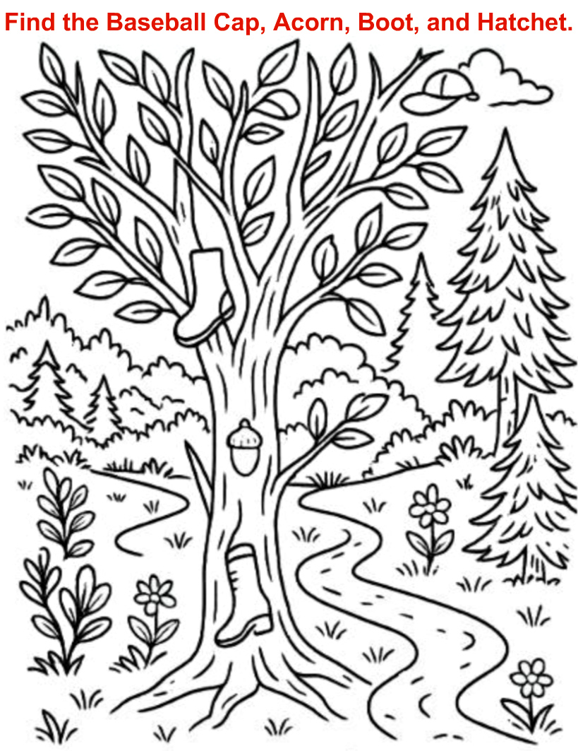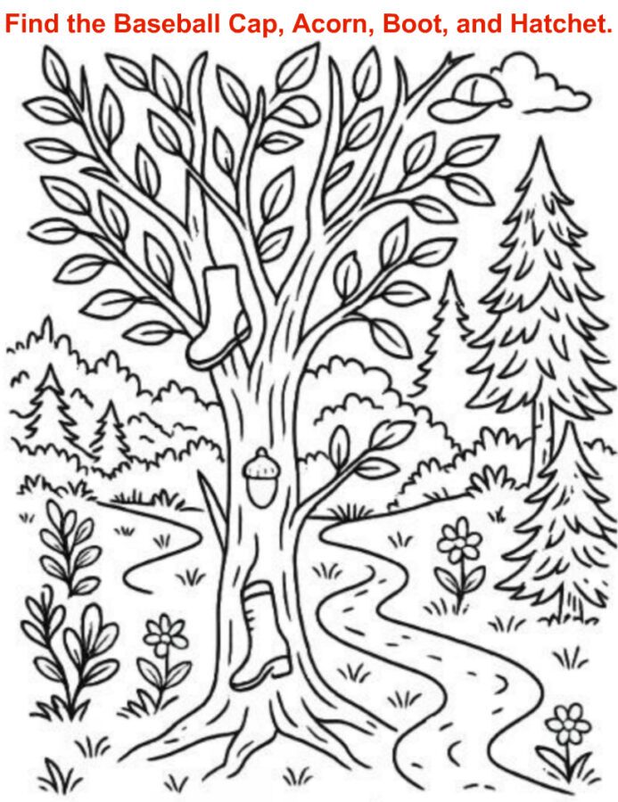 This charming forest scene, with its hidden baseball cap, acorn, boot, and hatchet, offers more than a simple pastime. It’s a doorway to sharper observation, focused relaxation, and that irresistible thrill of discovery. Whether you’re completing the puzzle solo, racing a friend, or introducing kids to the joys of hidden-object games, the sense of achievement you feel when you uncover that last item is unmatched. So print or save this woodland challenge, gather your sharpest pencils (or keenest eyes), and dive in—adventure beckons, and every leaf or root might conceal your next triumph. ➕