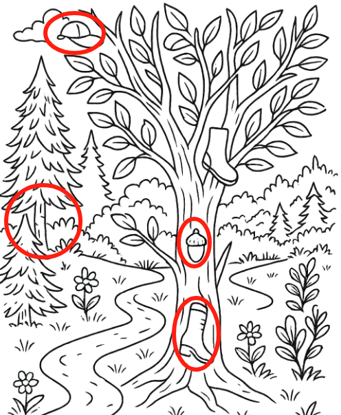 - Match Shapes and Silhouettes: Glance at the icon shapes below the puzzle (cap, acorn, boot, hatchet), then search for matching outlines in the drawing.