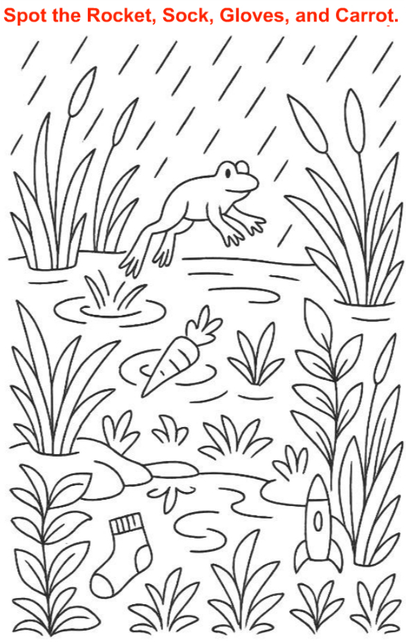 Our rainy frog pond scene isn’t just a simple drawing—it’s an invitation to explore, imagine, and celebrate the thrill of discovery. As you hunt for that carrot, sock, and rocket among raindrops and cattails, you sharpen your mind, relieve stress, and unlock your inner storyteller. Whether you’re sharing the fun with friends, challenging younger minds, or sneaking in a quick brain boost, this hidden object puzzle offers endless delight. So grab a printed copy (or sketch one of your own), settle in by a cozy window, and let the hunt begin—happy sleuthing! ➕