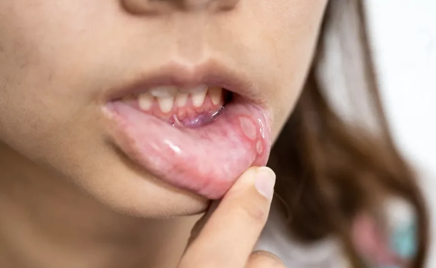 - Formation of blisters: Small, fluid-filled blisters develop, usually near the lips but sometimes on the nose or gums.