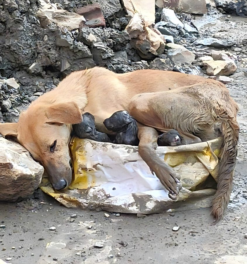 On a construction site in India, passersby discovered an emaciated mother dog with a newborn— lying among rubble and debris, shielding her puppies with all her strength. She couldn’t stand, but her maternal instinct kept her protecting the little ones at any cost.