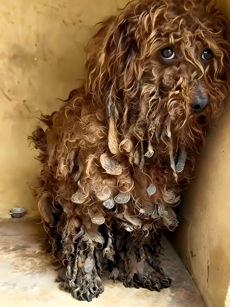 For days, the endless rain had poured down relentlessly, turning the back alleys of the city into a quagmire. One of these gloomy afternoons, a thin, almost imperceptible moan cut through the melody of the raindrops. Hidden by a crumbling wooden fence, barely visible among the dirty remains, lay a small, tangled creature. Her fur, once a bright reddish-brown, was now a tangled mess, heavy with dirt and water. Her eyes, wide with ancient t.e ŕror, had a special depth that spoke of countless nights spent alone. She was so weak that she could not even lift her head, her thin figure trembling with cold and hopelessness that seemed to radiate from her very being. This was Lucky, a name she would acquire much later, a name that would become a symbol of an incredible victory over all difficulties. But at that moment, she was just another forgotten soul, teetering on the brink of oblivion. The person who found her, a nondescript Sarah, on her way home from work, was hesitant at first, having seen too many such scenes before. But something in Lucky’s eyes, a flicker of pleading that transcended her broken spirit, made Sarah stop, reach out, and offer a kindness that would set in motion a chain of events more miraculous than she could have imagined.