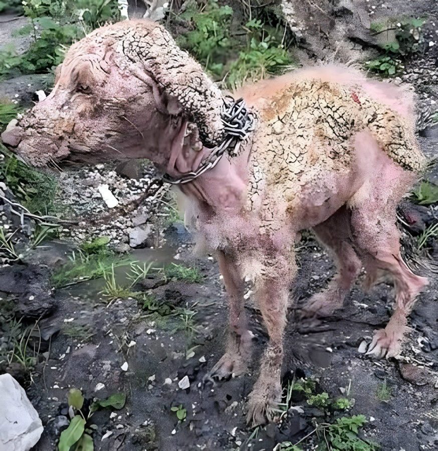 In the center of a small area covered in gravel and dirt, a defenseless, emaciated dog lay exhausted under the scorching sun. His b.a ŕe, raw, cracked skin was peeling off in chunks, and every movement caused him excruciating p.a ìn, causing b.l σod to ooze from the open w.o ∪nds. The rusty leash that b.i ŧ into his neck was pulled so tight that the tender skin t.o ŕe, revealing exposed red tissue. With each breath, a weak, muffled groan, full of s.u ƒfering and anguish, was heard.