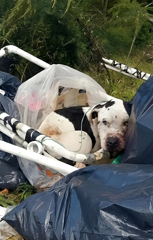 Early in the morning, when the city was just coming to life, the narrow street behind the row of buildings was filled only with the metallic clatter of a distant garbage can. Among the abandoned boxes and scattered bags sat a young pit bull—motionless on the outside, but with eyes full of p.a ìn and disorientation. The dog’s face was severely swollen, and b.r ∪ises betrayed the a.b ∪se. Hunger was g.n αwing at him, but worst of all was the feeling of utter abandonment.