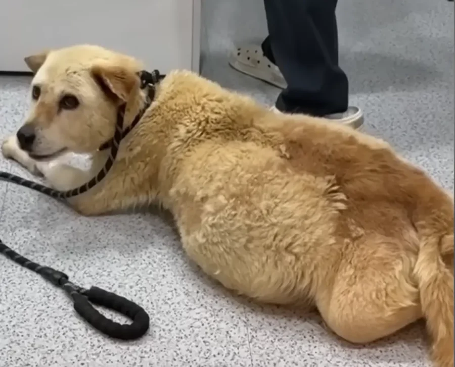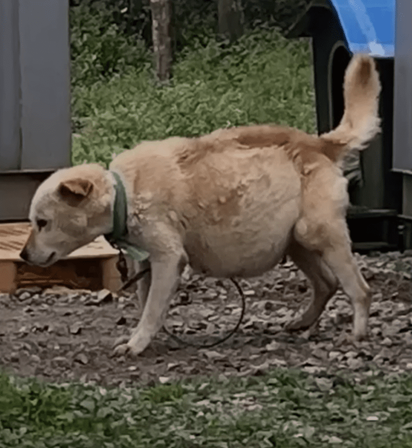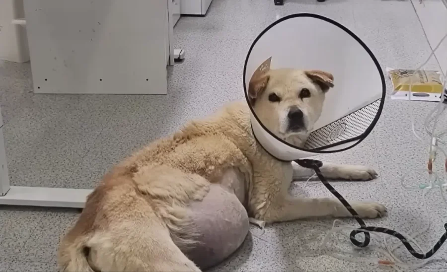 A dog was reported in c.r ìtical condition — her belly so swollen it looked as if it could burst at any moment.