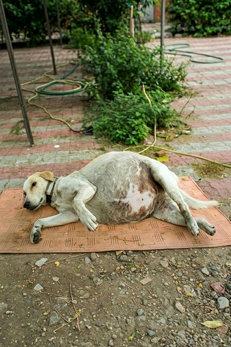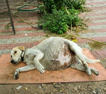 This female dog was found living on the streets with a belly so swollen it was filled with fluid.
