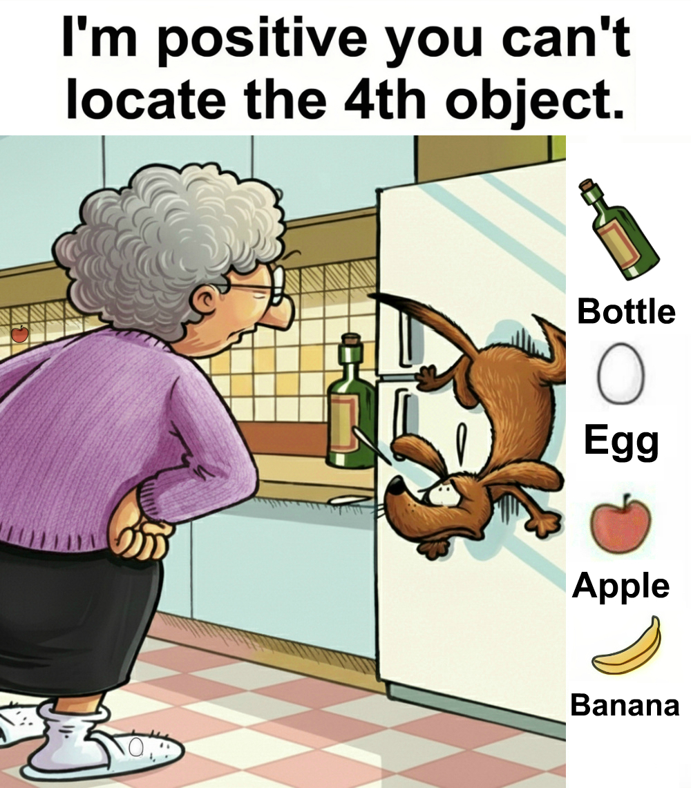 Find Bottle, Egg, Apple, Banana.