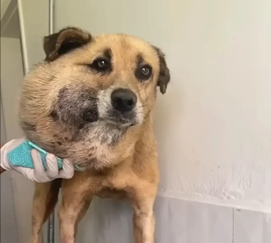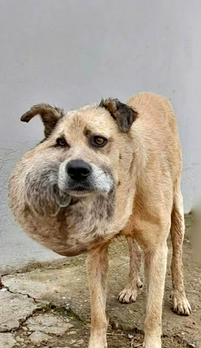 A stray dog stood alone on the roadside, his body weighed down by a massive t.u ḿor.