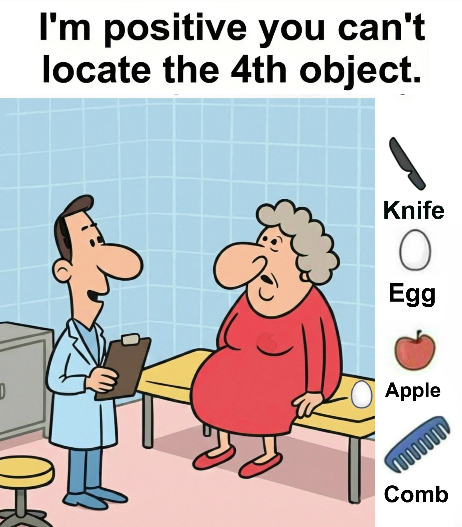 Find Knife, Egg, Apple, Comb.