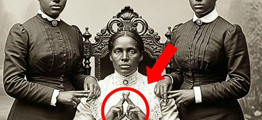 It was just a portrait of a mother and her daughters, but look more closely at their hands: Dr. James Mitchell had spent 15 years studying photographic archives at the New York Historical Society, yet he had never seen anything quite like this portrait, which arrived in a donation box from an estate sale in Brooklyn containing dozens of glass plate negatives wrapped in yellowed newspaper from 1923, most showing typical late 19th-century scenes of stern merchants, wedding parties, and children in Sunday clothes, until one image stopped him cold—three African-American women stared back through time, a mother of about forty seated in an ornate wooden chair with her two daughters, likely in their late teens or early twenties, standing on either side, all dressed in their finest high-collared dresses with intricate lacework, hair styled with care against a painted studio garden backdrop common for the era, and what unsettled James was not their dignified expressions but their hands: the mother’s hands rested in her lap with fingers interlaced in an unusual, deliberate pattern, her right thumb crossed over her left with index and middle fingers extended while the others curled inward,