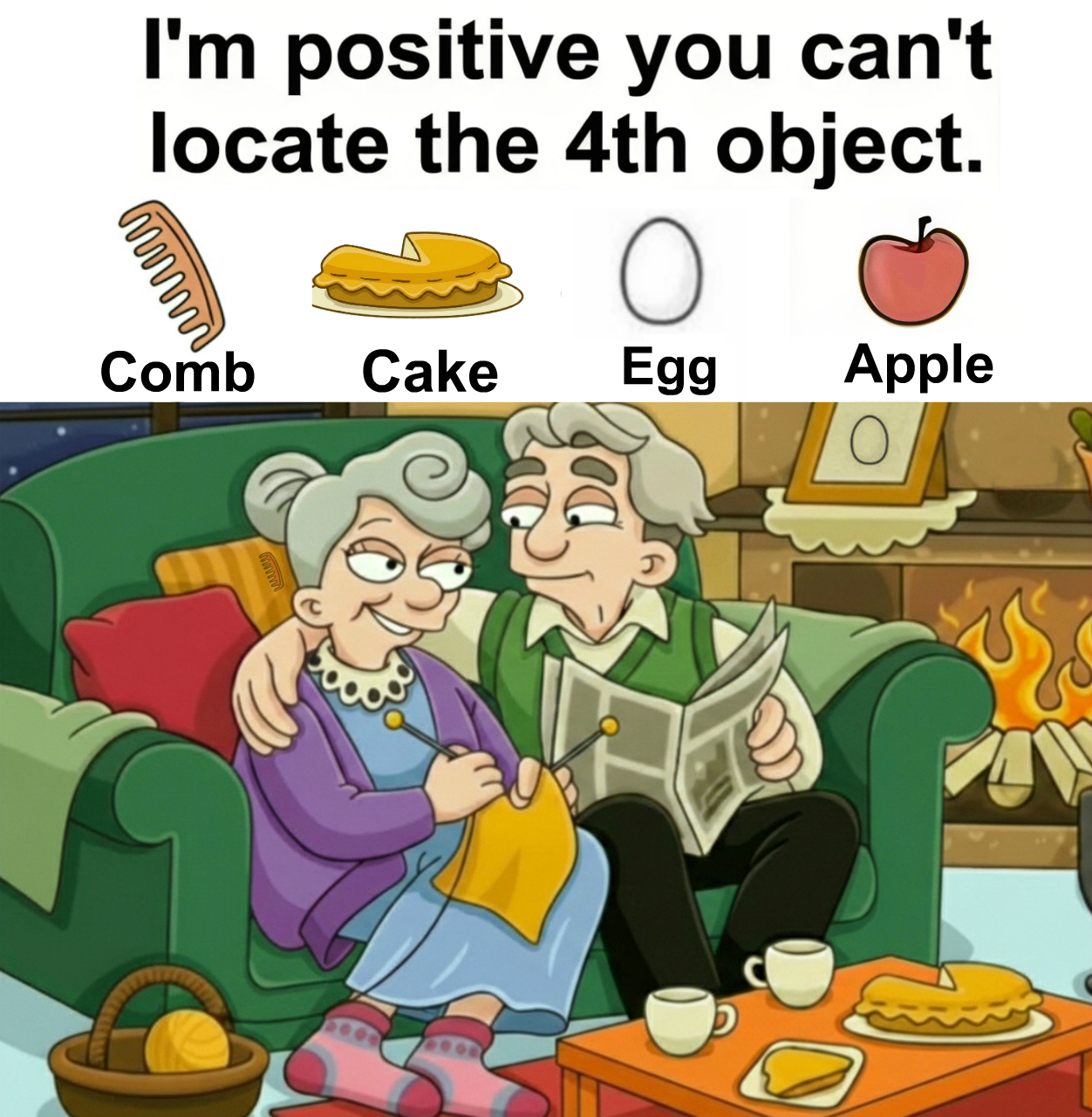 Find Comb, Cake, Egg, Apple.
