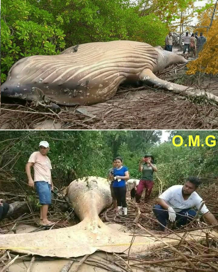 The b.o đy of a humpback whale was found in the jungle of Marajó Island in Brazil, but how the enormous mammal suddenly appeared there remains a mystery. The Instituto Bicho d’agua, a non-governmental organization operating on the island, reported this on Facebook.