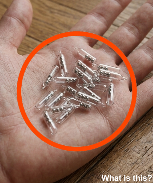 After some research, I discovered they’re most likely mercury tilt switches — small components used in older electronics. When the tube tilts, the metal inside moves and completes an electrical circuit. Simple, but clever.