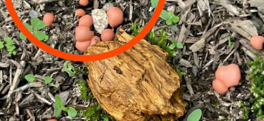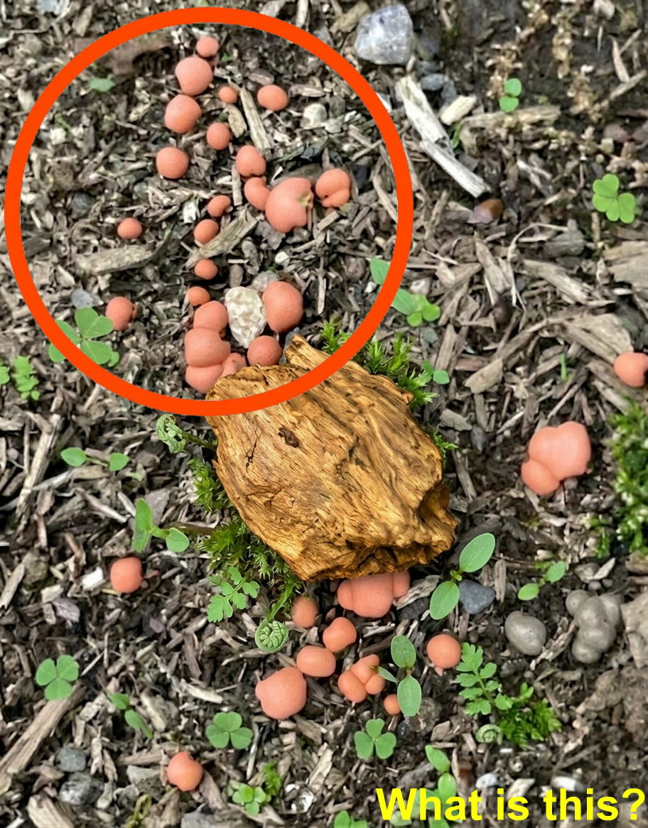 Those strange orange balls were actually a type of slime mold, often called “wolf’s milk.” It usually grows on old tree stumps, decaying wood, or damp soil. When young, it forms small swollen balls that can look bright orange or pink.
