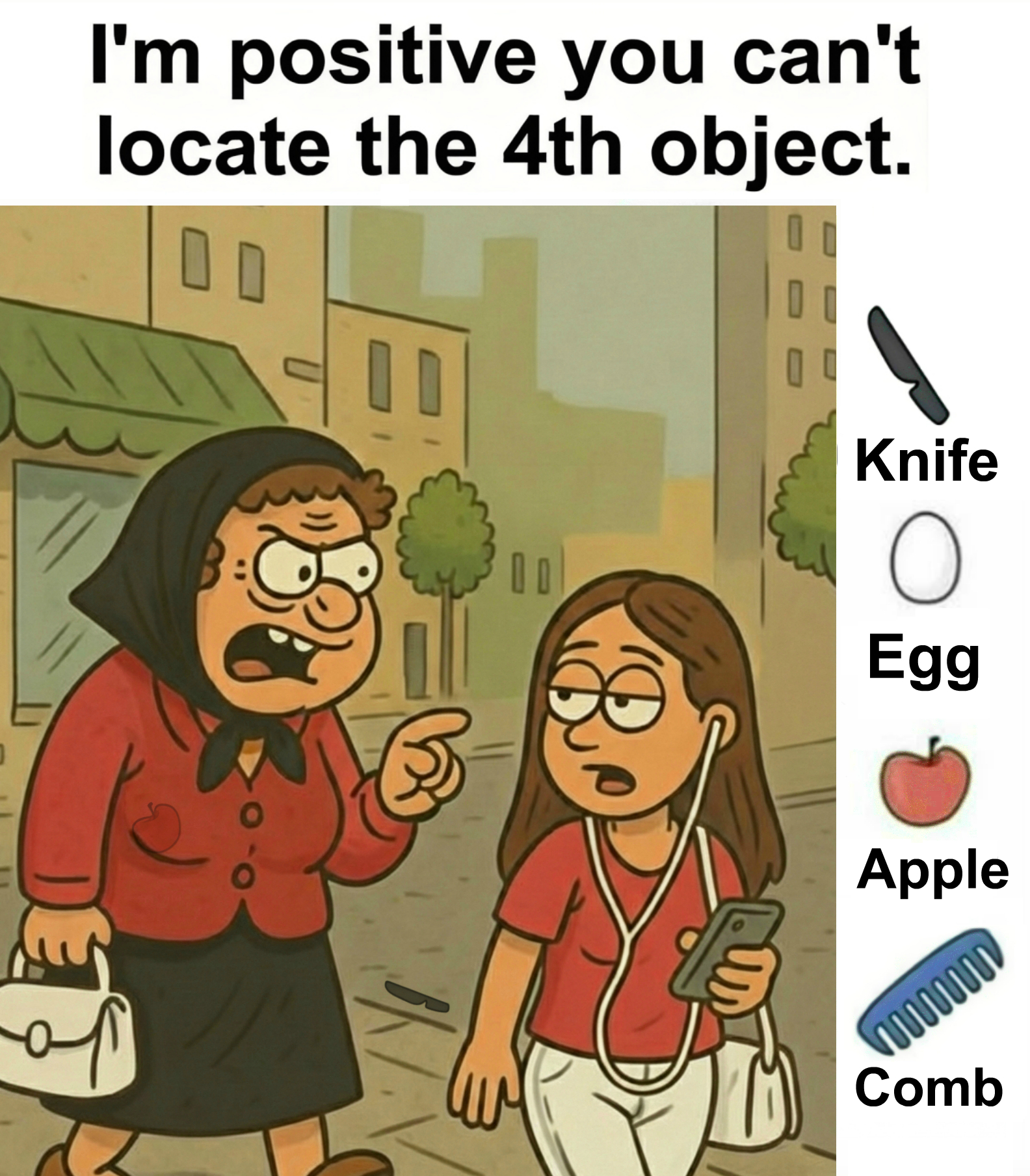 Find Knife, Egg, Apple, Comb.