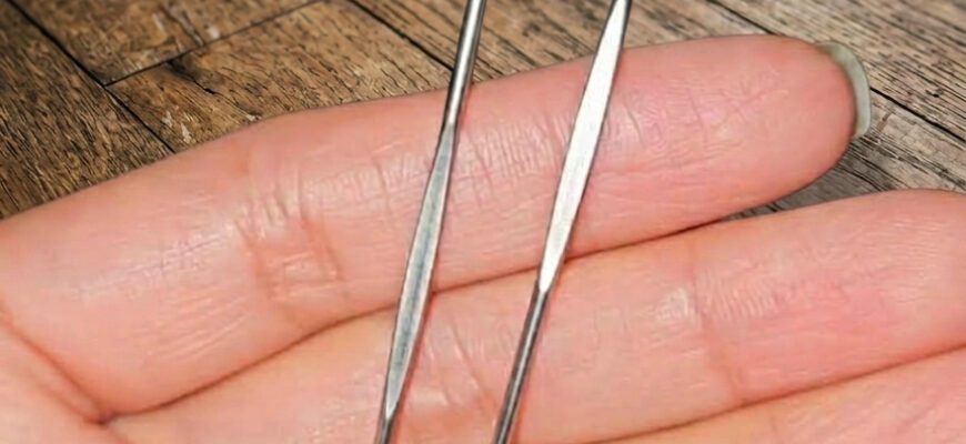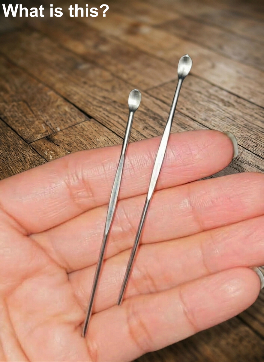 Two tiny metal objects, very thin, with a kind of mini spoon at the end… and no explanation at all.