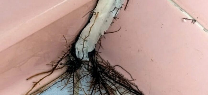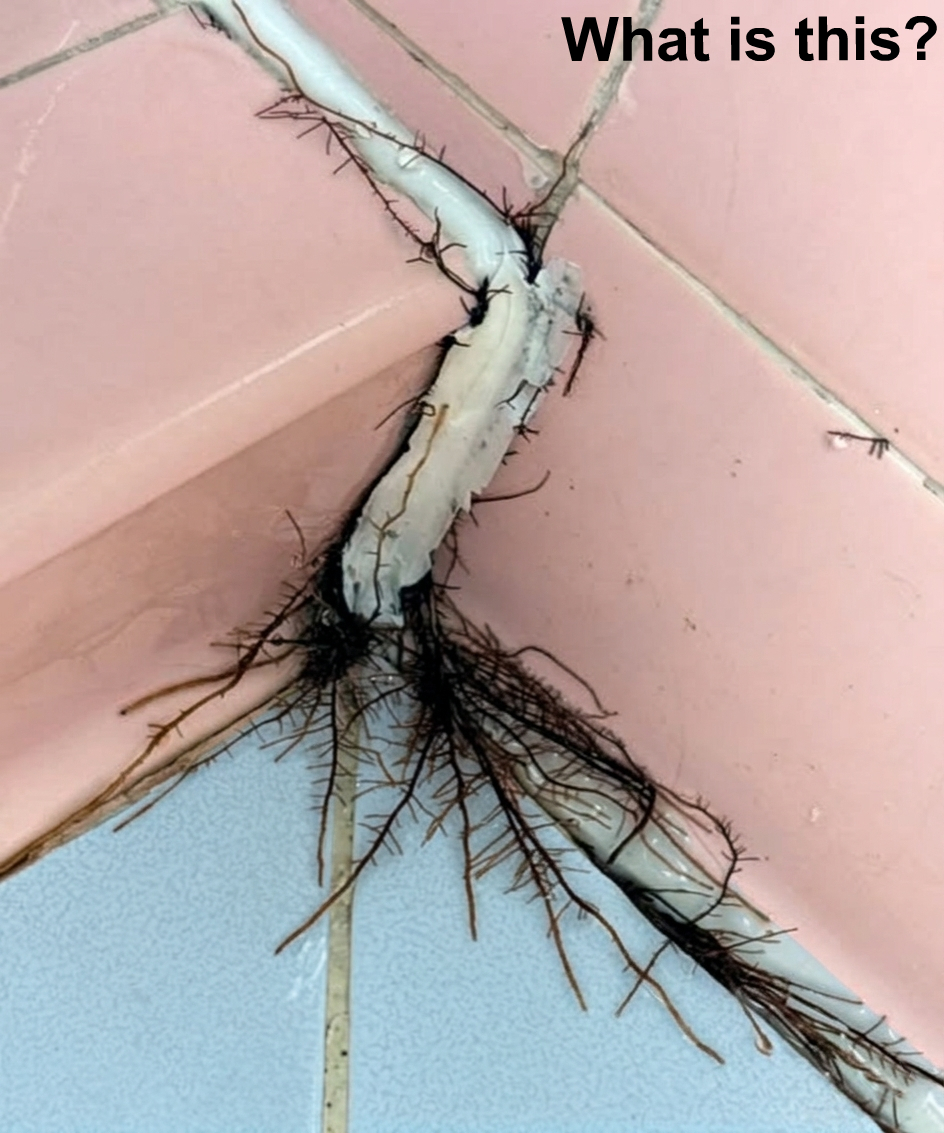 Yes — real roots. They likely came from a tree or plant outside (or even under the building), found a tiny crack, and started growing through the tile because of the moisture in the bathroom. Those thin “hair-like” strands are feeder roots searching for water.