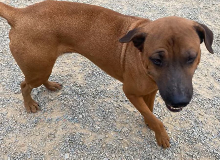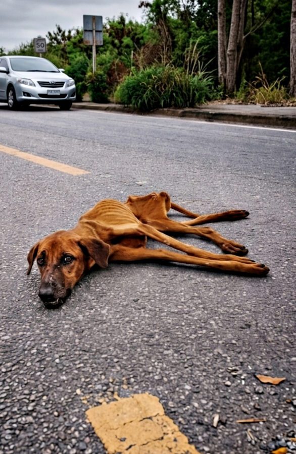 He was found lying on the road, too weak to even stand, his fragile body stretched across the cold ground as if he had already given up.