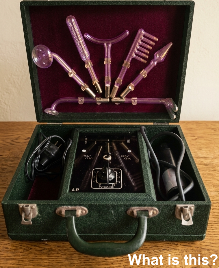 👉 It’s actually a vintage “violet ray” electrotherapy device, once used for skincare treatments, hair stimulation, and early cosmetic therapy.