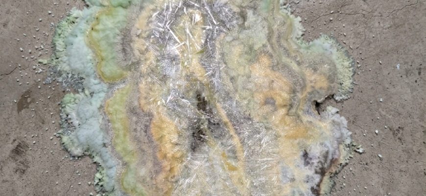 Turns out, it’s actually crystallized antifreeze — a leak that dried overnight and formed these unusual crystal patterns.