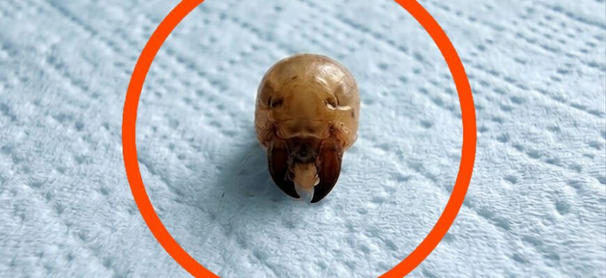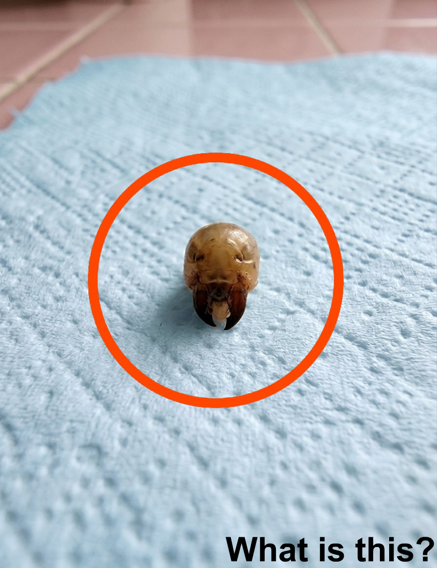 👉 It’s actually the head of a beetle larva (a grub), with its tiny mandibles still attached.