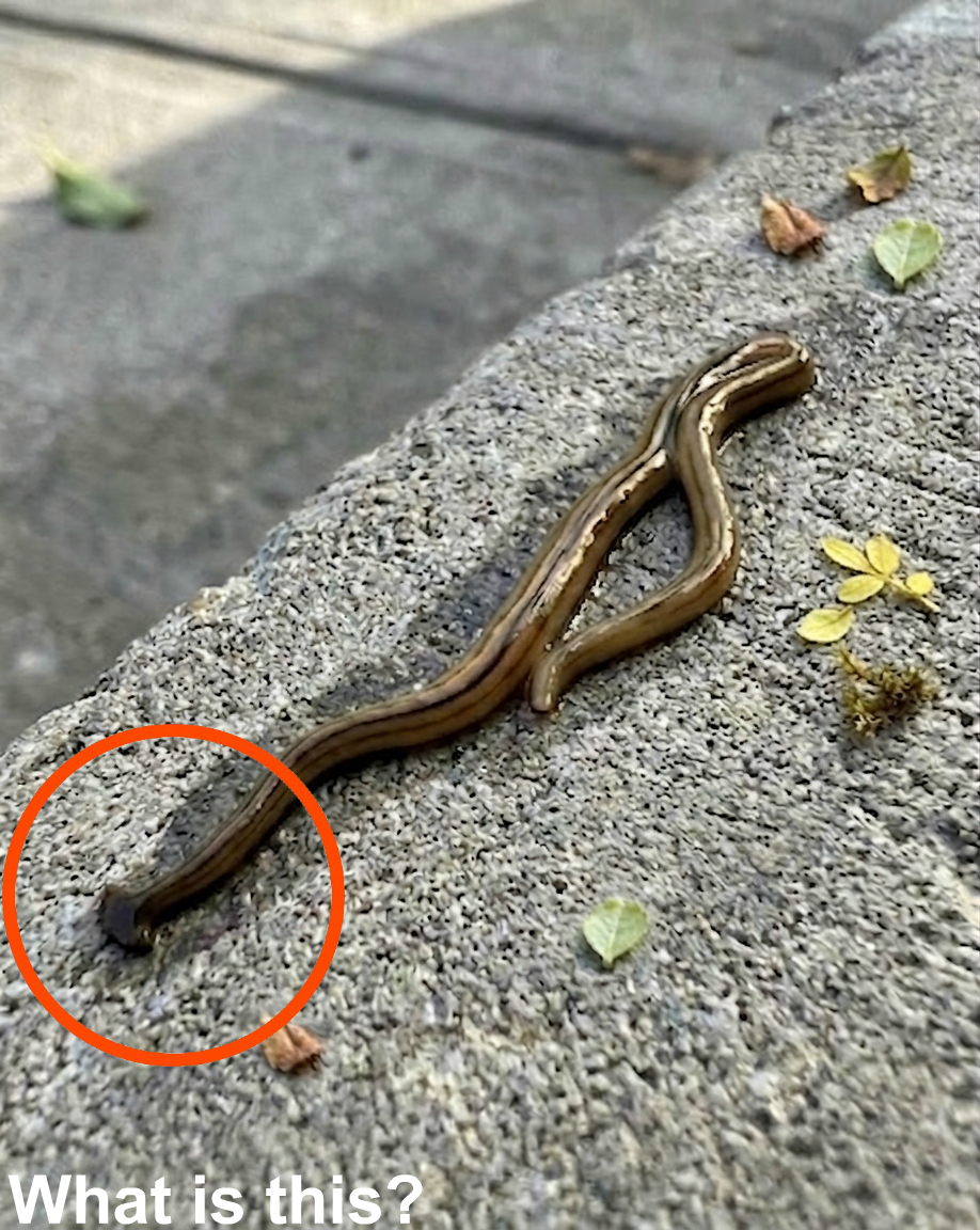 Early in the morning, I went outside to get some fresh air and found this. At first, I thought it was just a worm with some grass stuck to its head, but when I looked closer, I realized that wasn’t it. I have no idea what it is.