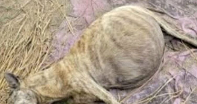 A gaunt dog lay on the parched ground, almost drained of strength—her thin body betrayed the weariness of hunger and the long st.r ∪ggle.