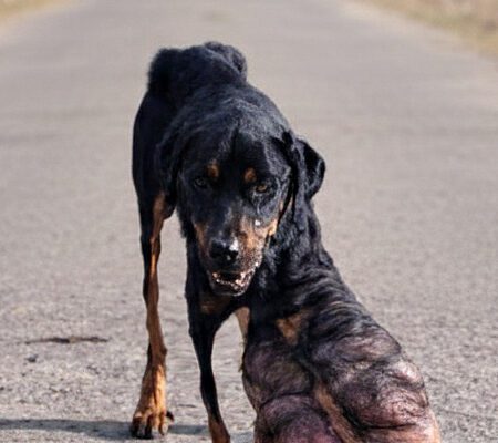 When we saw him, our hearts shattered. A Rottweiler was wandering the streets, his leg g.r σtesquely s.w σllen, his body thin from long-term hunger.